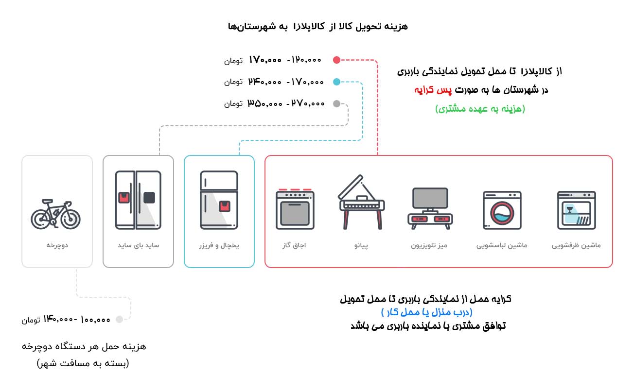 - اگر کالای شما جزء کالاهای سنگین باشد در تهران، اسلامشهر، کرج بسته به وزن و ماهیت کالا از 50,000 تومان تا 144,000 تومان  و در حومه تهران ( فیروزکوه، دماوند، هشتگرد، طالقان ) و شهرهای ذکر شده  پس کرایه  ارسال میشود .